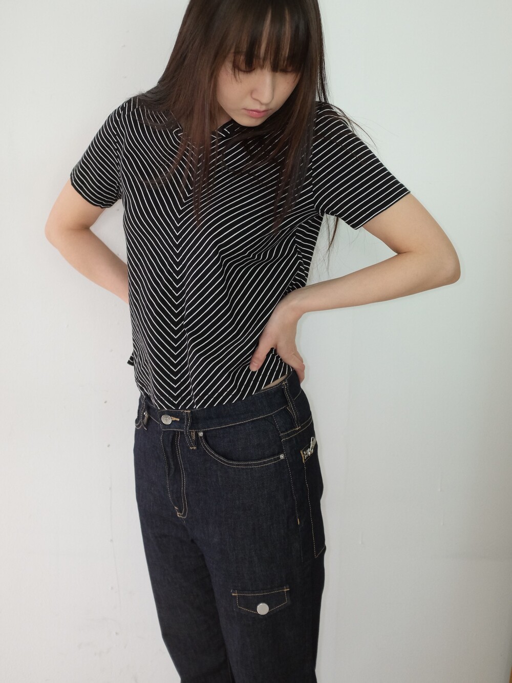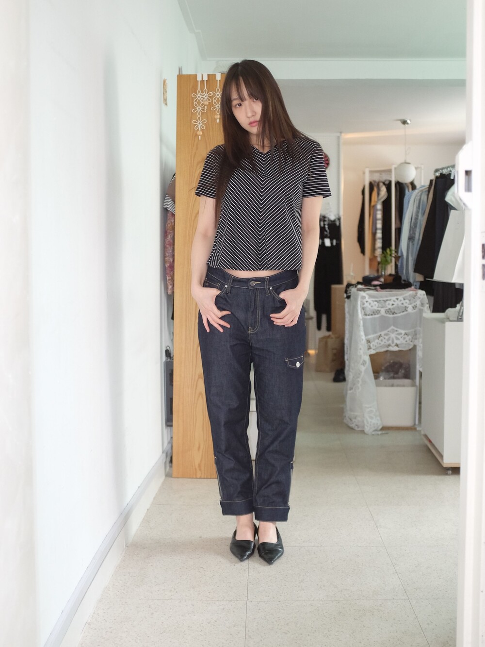 하의의 경우 모델 사이즈에 맞게 허리 조절이 있을 수 있으므로