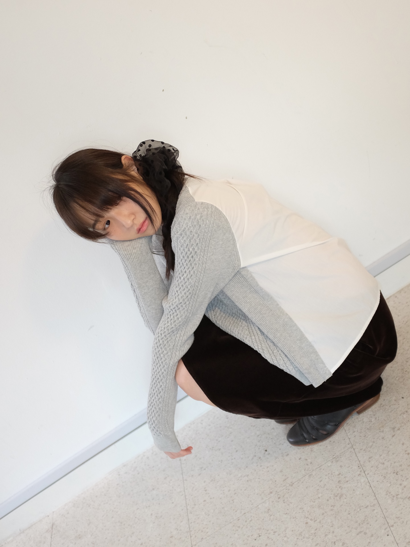 - 앞, 뒤 배색 컬러감과 대비되는 소재감이 매력적인 니트탑